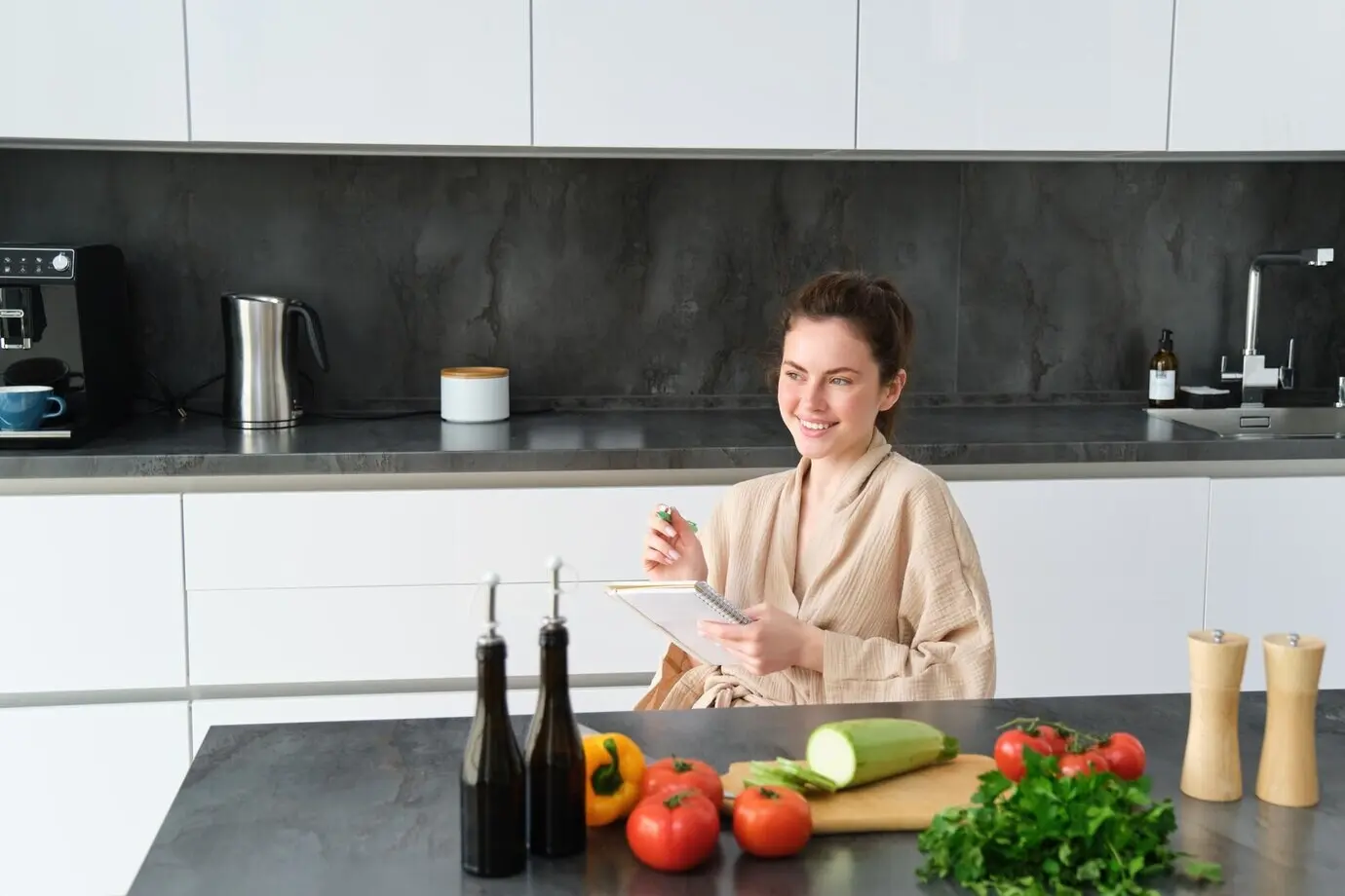 Eine Minute Kniebeugen mit Halteunterstützung, eine Minute Einbeinstand links, eine Minute Einbeinstand rechts, eine Minute schiefe Liegestütze, anschließend eine Minute Unterarmdehnung. Prüfe nach jeder Minute kurz deine Haltung, schüttle Spannung aus, und kehre ruhig an den Topf, Pfanne oder Schneidbrett zurück.
